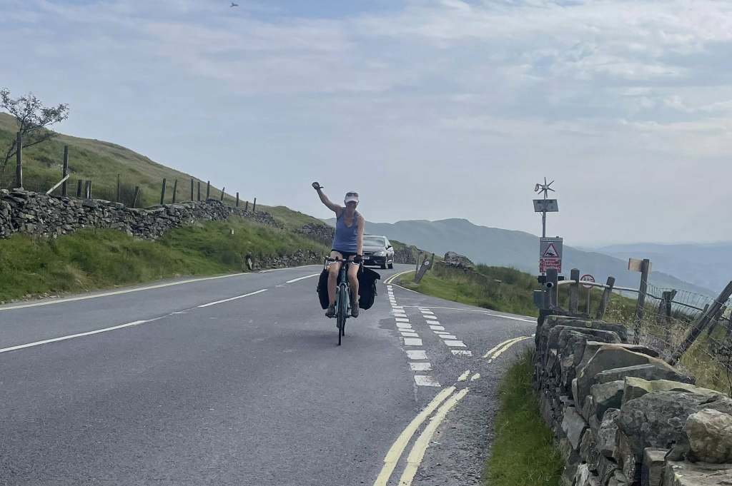 The day starts gently enough, in the towns around Morecambe bay, then we leave the level path and head into the hills. Cumbria makes its presence felt with a slew of hills, each one a warm up for the pass. Kendal is perfectly placed for lunch (and climb-fuelling Kendal Mint Cake), then at Windermere we have a final pit stop before the climb, where we are surprised to hear someone yelling encouragement from the side of the road. It’s one of our online followers (another Andy) who took a punt on us being somewhere on this road, and has driven out to support our climb.