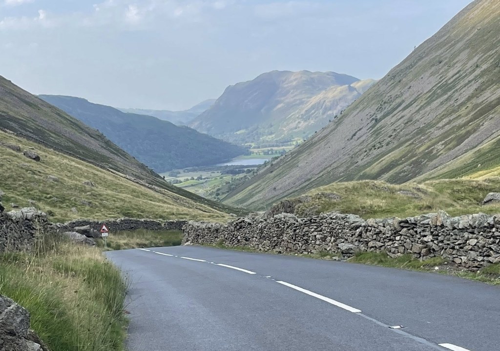 The scenery is spectacular: vertiginous hills on one side as the road twists and turns upwards. Eventually it crosses the ridge and now the vertiginous hills are on the other side, leading down towards the silver smear of Windermere. The traffic isn’t too busy, and it tends to collect behind one vehicle, so you get long stretches of nothing then a few in a row, so it’s easy enough to pull over to let it all pass. Once we’ve settled into the climb it’s not so bad. There are steep stretches, and steeper stretches, and not so steep stretches, and sometimes even a moment to freewheel.