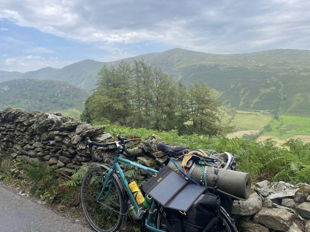 The descent on the other side is just as epic as I remember, and the others are away, much more daring descenders than me. Tim was the same, leaving me standing. We flow down towards Ullswater, and through the farmland to the lake where we’ll camp. We’ve done it: a Lake District pass fully loaded, on a sunny day, in memory of a friend who loved riding through the mountains. We’re all buzzing.