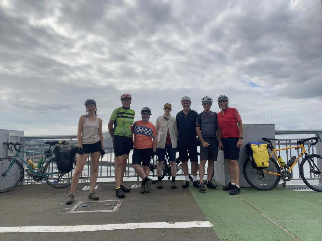 This is the largest team yet: our new riders are Alan, who joined us just outside Lanark, Nigel, who met us at our lunch stop in Livingston and another Mark, who was waiting for us as we approached the bridge, together with Jeff who will turn for Edinburgh station and home after the bridge.