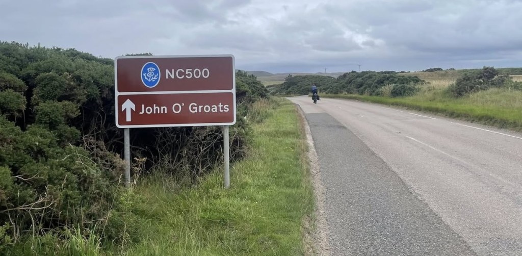 Not long after setting off we pass a NC500 sign for John o’ Groats – the first time we’ve seen our ultimate destination on a road sign. It feels wild that we’re within touching distance of our goal. It’s a strange psychology, doing a ride that is so focussed on one place: throughout our journey, whenever anyone has asked where we’re going, we’ve replied “John o’ Groats”. It’s been the mysterious, far-away destination, almost legendary, whenever we’ve talked to anyone about what we’re doing. And now here we are, looking at a sign that points to John o’ Groats. We have made it this far. We are so nearly there.